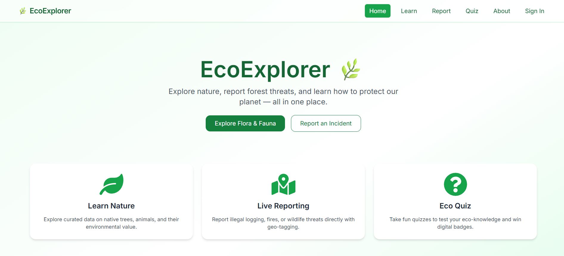 EcoExplorer is a modern environmental awareness platform that allows users to explore flora and fauna, report illegal activities, and engage in interactive learning through quizzes and real-time data.